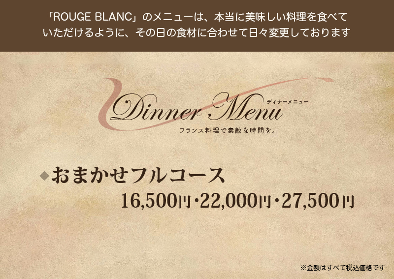 「ROUGE BLANC」 のコースは、ランチ・ディナーともにフルコースをお出ししております。